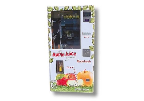 Máquina automática de autoservicio que suministra zumo de manzana recién hecho en botellas a partir de manzanas frescas, con una solución añadida de agua y ácido ascórbico (Vitamina C) para evitar la oxidación natural.