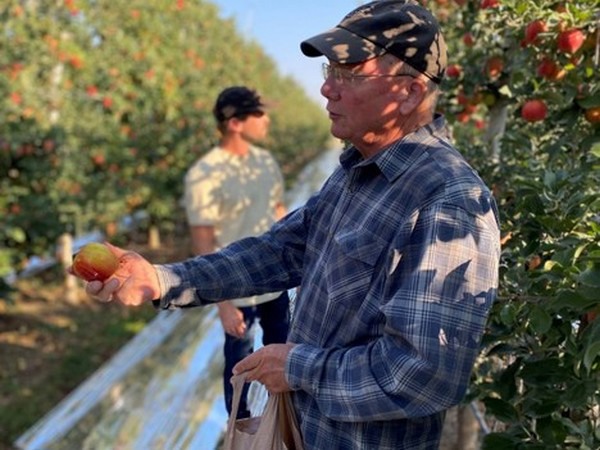Dave Gleason prueba las manzanas Autumn Glory antes de la cosecha.