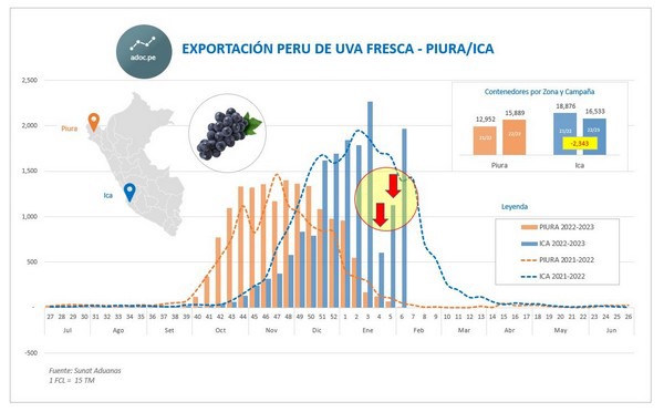 La exportación de uvas de mesa en Perú en la zona septentrional (Piura) y meridional (Ica) en comparación con la campaña previa muestra un incremento de los volúmenes de contenedores. En el norte del país, el volumen ha crecido un 23% hasta acercarse a los 16.000 contenedores en comparación con los 13.000 contenedores de la campaña anterior en 2022.