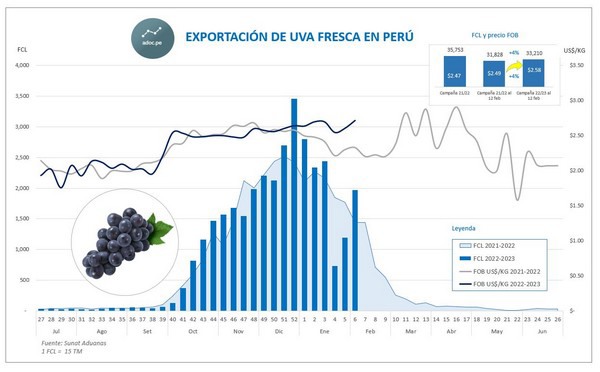Exportaciones de uva de mesa de Perú en la semana 6 de 2023.