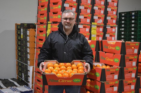 El comprador y vendedor Frank Wilberg mostrando clementinas Orri frescas de Israel.