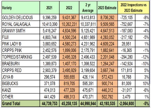 Sin embargo, se prevé que las manzanas y las peras experimenten un descenso en las cifras de exportación para 2023. Se espera que las exportaciones de manzanas disminuyan un 5%, hasta 43,19 millones de cajas, y las de peras un 6%, hasta 19,86 millones de cajas. Incluso con este descenso previsto, las cifras esperadas son ligeramente superiores a la media de dos años para las peras y solo ligeramente inferiores para las manzanas.