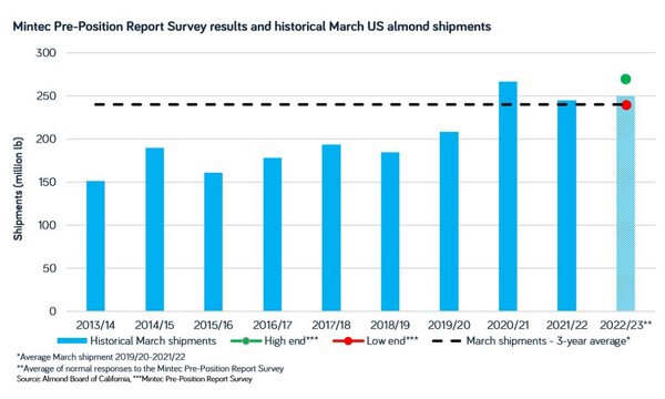 Los participantes en el mercado encuestados por Mintec en la primera semana de abril esperaban fuertes envíos antes del informe de marzo. Las estimaciones para los envíos de almendra en febrero se situaban entre 240 y 270 millones de libras, y la mayoría de los participantes en el mercado informaron de cifras de 245 a 255 millones de libras.