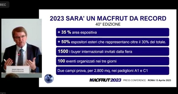 Macfrut 2023 (3-5 de mayo, en los pabellones de Rímini) se presentó el pasado 13 de abril en Roma con el presidente Renzo Piraccini visiblemente satisfecho: "Ya contamos con 1.100 expositores, nuestro récord histórico, un 35% más de área de exhibición y una presencia de operadores extranjeros en torno al 30% del total, duplicándose respecto a las ediciones anteriores".