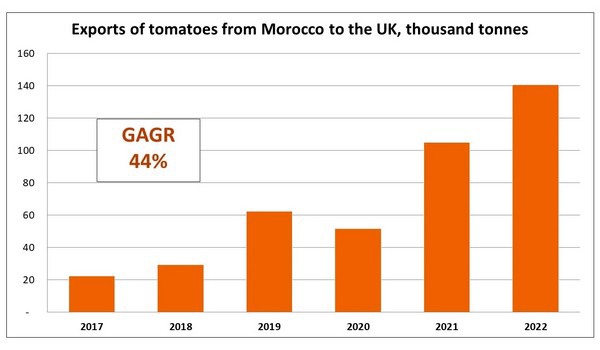 En los últimos cinco años, los productores locales de tomate han ido aumentando cada año su oferta dirigida a los mercados del Reino Unido, y a finales de 2022, los volúmenes de ventas aumentaron hasta alcanzar la cifra récord de 140.000 toneladas.