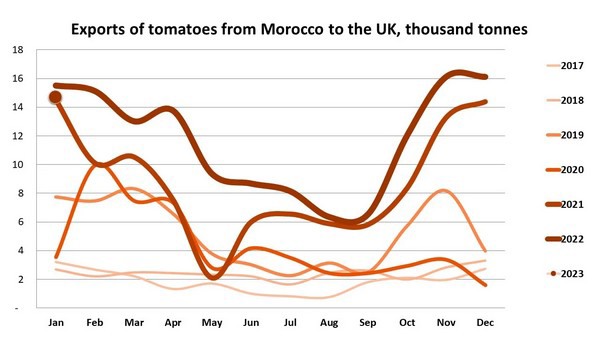 La oferta de Marruecos al Reino Unido alcanza su pico durante los meses de invierno. En la primavera de 2021, se produjo un descenso de las exportaciones. Sin embargo, en 2022, los exportadores marroquíes de tomate lograron ampliar la temporada de venta de hortalizas, lo que se reflejó en el aumento anual de la oferta.