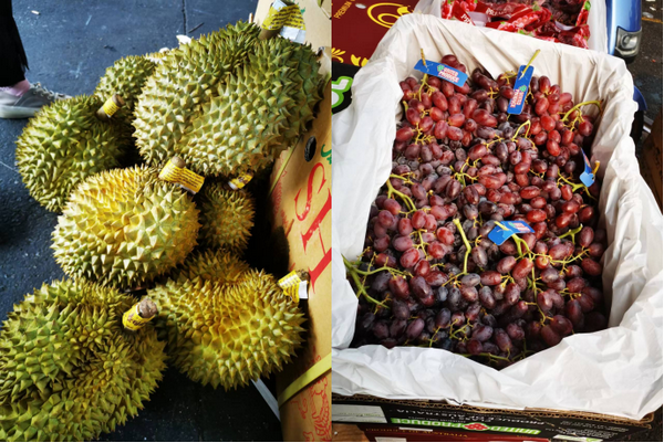 Izquierda: durianes tailandeses Monthong. Derecha: uvas australianas.