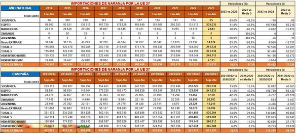 De acuerdo con el informe de Seguimiento reforzado de las importaciones de cítricos por la UE publicado por el Ministerio de Agricultura, Pesca y Alimentación, en la campaña 2022/23, entre septiembre y abril, se han importado 613.597 t de naranjas, lo que supone un incremento del 22,4% respecto al mismo periodo de la anterior 2021/22 (+112.400 t) y un +9,8% (54.800 t) más que la media.