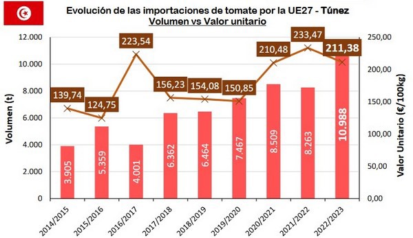 Paralelamente, desde Túnez también se importaron a la UE 2.533 t, que representaron un 15,9% más de tomates respecto al mismo mes de 2022, y un 23,1% más respecto a la media.