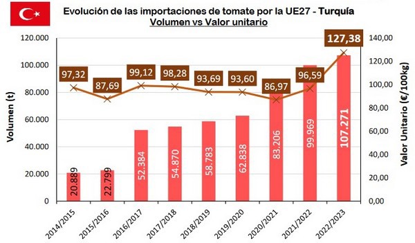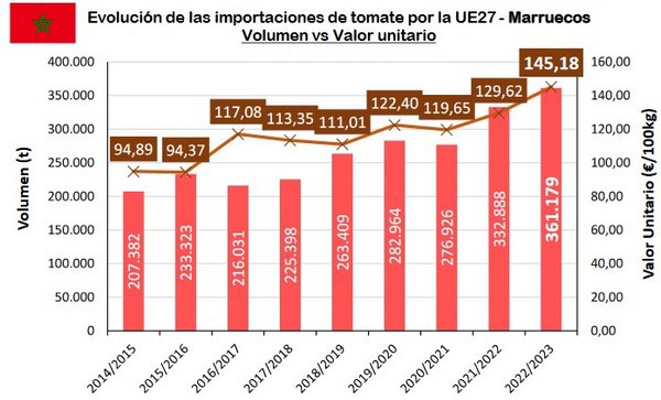 El valor unitario de los tomates de Marruecos importados en la UE se ha situado en el periodo analizado en 145,18 €/100 kg, creciendo un 12% respecto a la campaña pasada y un 21,8% respecto a la media de los últimos 5 años.