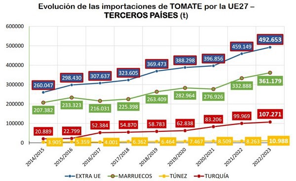 El tomate es, junto con los cítricos, uno de los productos cuyas importaciones de terceros países en la UE están sujetas a un seguimiento reforzado por parte del Ministerio de Agricultura, Pesca y Alimentación. Y es que las cifras evidencian un innegable aumento en el volumen de tomates de procedencia extracomunitaria adquiridos en la UE en los últimos años; de Marruecos principalmente, pero también de otros países mediterráneos como Turquía y Túnez.