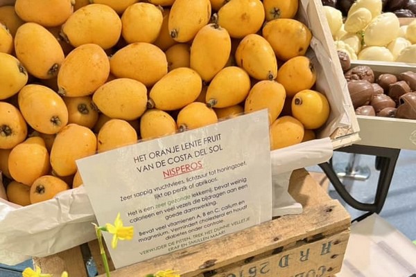 Los nísperos españoles son uno de los "nuevos" productos que la tienda ofrece en primavera. "Es la primera fruta de primavera de España y Portugal. Nuestro proveedor, Postuma, nos la ofreció, e inmediatamente decidí comprarla. Se parece un poco al albaricoque y es muy medicinal. En España y Portugal todo el mundo la conoce; muchos tienen árboles en sus jardines. Después de las manzanas y las peras, es una fruta maravillosa para empezar la temporada de primavera".