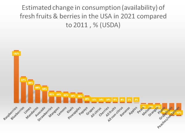 Los expertos de EastFruit ponen de relieve una información muy interesante publicada recientemente en Estados Unidos relativa a las tendencias de consumo de diversas frutas y berries en el país durante la última década.