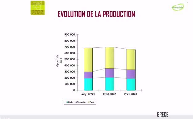 En 2023, Grecia no sufre ningún problema meteorológico. Se prevé una producción casi idéntica a la del año pasado, pero con un ligero descenso de los melocotones y nectarinas (-5% con respecto a 2022), y una disminución más importante de la pavía (-4%). El país debería alcanzar así un total de 665.000 toneladas este año, cerca del potencial de producción.