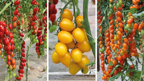 Desde la izquierda: el tomate datterino TT-1053, el tomate pera amarillo 79943 y el tomate datterino naranja Cantando F1.