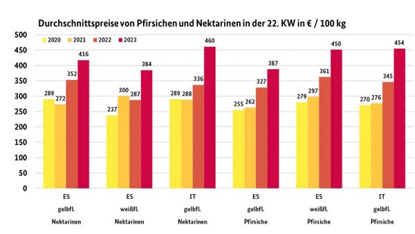 En la línea de la situación estacional, predominaron los envíos españoles, tanto de melocotones como de nectarinas, seguidos por los productos italianos. Las primeras frutas procedentes de Grecia aparecieron en Fráncfort y Múnich, pero la calidad no siempre convenció. Según el BLE, la disponibilidad había aumentado ligeramente en general y fue suficiente para satisfacer la demanda.