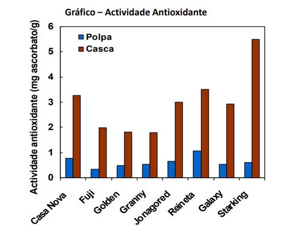 La asociación compartió los resultados de una estudio que comparaba la cantidad de antioxidantes en la pulpa (color azul) y en la piel (color marrón) de las manzanas según variedades.