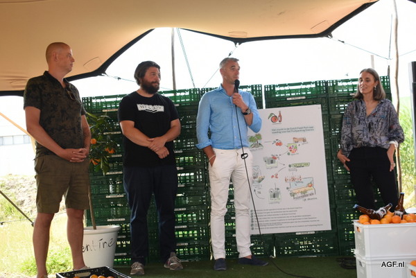 En una tarde soleada, socios, empleados y otras personas interesadas se reunieron en el Café Clementine para degustar el primer, y por ahora único, lote de esta radler. El acto también sirvió para explicar cómo se estableció la colaboración, que fue posible gracias a Fruitpacking District. "Somos especialistas en fruta, por supuesto", explicó Lennart. "Y siempre hay algún producto que no es lo suficientemente bueno para comercializarse. Una mandarina que está blanda, verde o no es lo bastante bonita suele tirarse, pero 'sostenibilidad' es la palabra mágica hoy en día, así que queríamos intentar hacer algo con esos descartes".