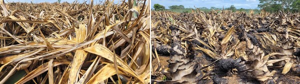 Izquierda: plantas de piña secas. Derecha: plantas quemadas, una práctica que sigue siendo habitual en Costa Rica.