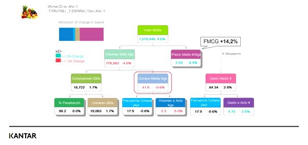El informe de Kantar referente al primer trimestre de 2023 respecto a los hábitos de consumo y compra de fruta fresca por parte de las familias españolas arroja datos que indican que los hogares nacionales acuden a comprar fruta fresca con menos frecuencia que años anteriores (-2,8%) y cada vez que lo hacen, adquieren menos cantidad.
