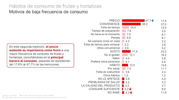 Entre los factores que explican esa discordancia que existe entre concienciación de buena alimentación y practicarla destaca sobre los demás la barrera de la percepción del precio. Llama la atención el drástico incremento de este parámetro, que ha pasado de 17,6% a 47,7% (+30,1%), siendo una de las cifras más llamativas también de este estudio.