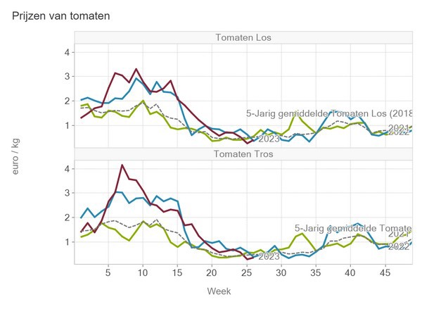 Al igual que el día más largo, el pico de producciones de hortalizas en los invernaderos belgas ya ha quedado atrás. Si bien la semana pasada el precio de los tomates volvió a subir en las subastas de la Federación de Cooperativas Hortícolas Belgas (VBT), las cotizaciones de los tomates sueltos y los tomates en rama no lograron igualar la media de los últimos cinco años.