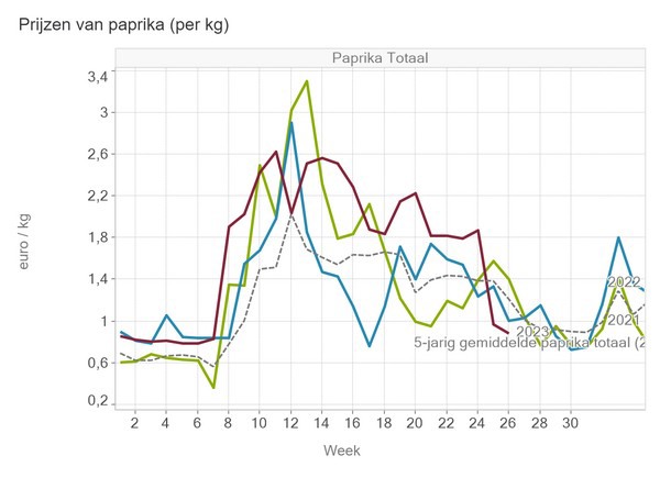 El precio de los pimientos, en cambio, continuó bajando la semana pasada. Solo los pimientos amarillos pudieron anotar una ligera subida de precios hasta los 78 céntimos de euro el kilo. Los pimientos rojos costaron 85,5 céntimos de euro, los verdes 81 céntimos y los pimientos naranjas, el color mejor pagado, se situaron en 1,56 euros el kilo en la semana 26.