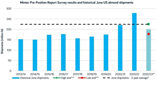 Los encuestados por Mintec en la primera semana de julio esperaban que los envíos y las nuevas ventas fueran moderados antes del informe de junio, cuya publicación está prevista para el 11 de julio. Las estimaciones para los envíos de almendra en junio se situaban entre 80.739 y 102.058 toneladas, y la mayoría de los participantes en el mercado daban cifras de 86.182 a 92.986 toneladas.