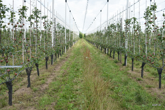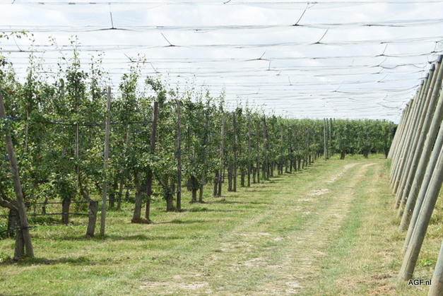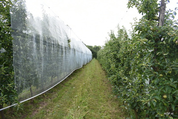 Este joven agricultor ecológico considera cada vez más importante colocar mallas antigranizo en sus plantaciones. "Poco a poco nos estamos pasando por completo a las mallas antigranizo y vemos muchos menos daños por el sol bajo estas secciones", afirma Gerard. Hermens Fruitsystems ha proporcionado las mallas.