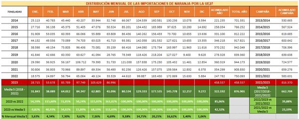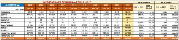 Centrándonos en la primera mitad del 2023, el total de naranjas importadas por la UE ha ascendido a 458.557 t, un 85,1% (+210.800 t) más que en dicho periodo de 2022 y un +42,3% (+136.400 t) que la media.