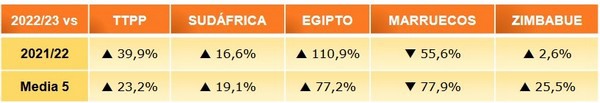 Le sigue rozando las 300.000 toneladas Sudáfrica, con una cuota del 36,6%. El país incrementa sus cantidades en un 19,1% (+47.900 t) respecto a la media y un 16,6% respecto a la campaña 2021/22 (+42.551 t).