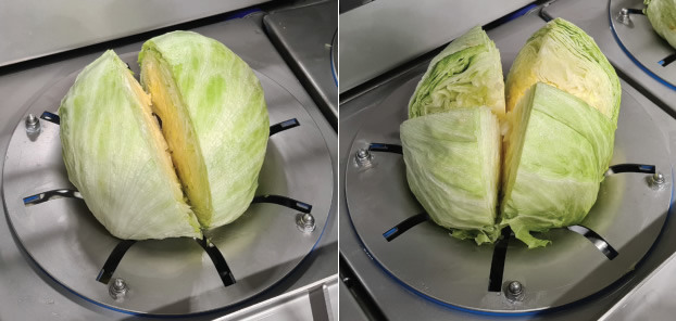 “OptiCor tiene una capacidad de hasta 60 unidades por minuto, con un único operador. Mediante el análisis de imagen, el sistema determina si el núcleo del cogollo está centrado y ofrece feedback en directo al operador a través de un sistema HMI inteligente. A continuación, el cogollo se dirige hacia la estación de descorazonado, donde es descorazonado perfectamente en función de sus características individuales”.