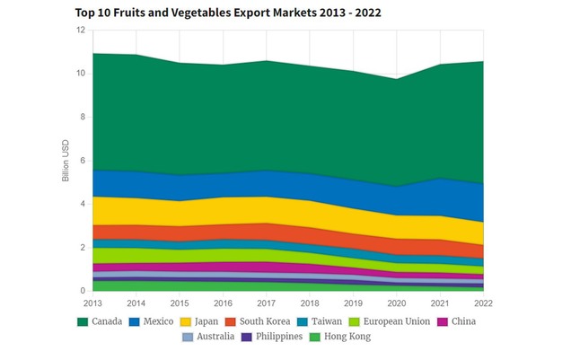 El valor total de las exportaciones de frutas y hortalizas estadounidenses en 2022 ascendió a 12.590 millones de dólares, con un volumen total de 7 millones de toneladas. Esta cifra contrasta con la media trienal de 12.250 millones de dólares, lo que supone un crecimiento medio compuesto del -0,48% (2013-2022).