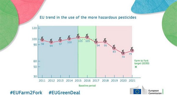 El pasado 5 de julio de 2023, la Comisión Europea publicó el progreso actualizado hacia los objetivos de reducción de pesticidas de la estrategia "De la granja a la mesa" para el período 2011-2021 en la Unión Europea.