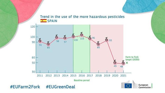 Sin embargo, hay grandes diferencias entre cada Estado miembro. En concreto, consultando la información proporcionada por la Comisión de cada país, en 2021 España ya habría alcanzado e incluso superado el objetivo de la estrategia "De la granja a la mesa" de reducir en un 50% el uso y el riesgo de los plaguicidas más peligrosos, disminuyéndolo un 52% respecto al periodo de referencia.