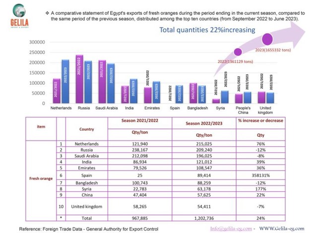 Gelila afirma: "Los cítricos egipcios tuvieron una gran demanda la temporada pasada, en medio de una escasez mundial de cítricos debida a condiciones meteorológicas desfavorables, sequías o inundaciones que afectaron a nuestra competencia en España, Sudáfrica y Marruecos. En este contexto, Egipto destacó por su producción abundante y de alta calidad. El éxito de las operaciones agrícolas fue acorde a los importantes avances en la calidad del envasado, la logística y la modernización de las plantas de envasado. Todos estos factores naturales y la actuación de productores y exportadores permitieron a Egipto alcanzar una temporada récord, tanto en volúmenes como en ingresos".