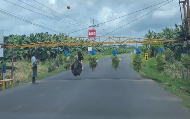 Echa un vistazo a este vídeo, que muestra cómo las frutas viajan en el "tren bananero" de camino al mercado. El "tren" de Costa Rica es en realidad un cable suspendido. El cable circula sobre un sistema de poleas para trasladar los bananos de un punto a otro durante su procesamiento.