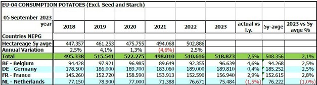 Si bien la producción de 2023 se compara con la de 2021, las necesidades de transformación han aumentado fuertemente. Los transformadores de toda la zona NEPG (Bélgica, Francia, Países Bajos y Alemania) necesitan al menos 2.000.000 de toneladas de patatas más que hace dos años. Tras las menores producciones en Polonia y el sur de Europa (debido a la menor superficie plantada y a las malas condiciones meteorológicas), la temporada de exportación ya ha comenzado y la competencia entre los compradores de la industria y la exportación volverá a estar a la orden del día.