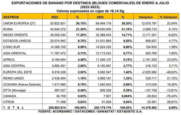 “En segundo lugar, la reducción de las tarifas de los fletes navieros, que ya están en niveles normales respecto al año anterior, cuando incluso se duplicaron y triplicaron en algunos destinos (generando alta inflación en mercados mundiales como Unión Europea, Estados Unidos, Rusia etc.); aunque los fletes a Rusia siguen altos aún. Lo anterior hizo que el costo de importar banano se haya reducido, y es por eso por lo que destinos como la Unión Europea, Estados Unidos, Reino Unido, y otros países, han comprado más banano en estos 7 primeros meses del 2023 al Ecuador”.