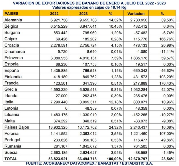 La UE-27 es, de hecho, el destino que ha registrado un mayor crecimiento en los primeros 7 meses de 2023, un +23,54%, impulsado por el crecimiento en las compras de los que ya son los mayores compradores del continente: Países Bajos, que con casi 16,2 millones de cajas de banano aumentó sus importaciones un 16,08%; Alemania, que adquirió 9,7 millones de cajas (+39,50%); Italia, con la compra de 8,1 millones de cajas (+10,96%); Bélgica, con 6,9 millones de cajas (+6,64%); Grecia, con 6,5 millones de cajas (+42,07%), o Eslovenia, con 4,9 millones de cajas (+59,57%).