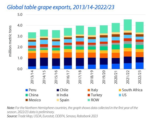 A pesar de una disminución global de las exportaciones del 5% en la temporada 2022/23, muchos países están ajustando su producción para satisfacer la demanda y mejorar la eficiencia operativa. "Esta ha sido la segunda temporada de exportación mundial de uva de mesa más alta de la historia, solo superada por la anterior de 2021/22. Esperamos que la tendencia al alza de las exportaciones observada en la última década continúe en los próximos años", afirma Gonzalo Salinas, analista de Productos Frescos de Rabobank.