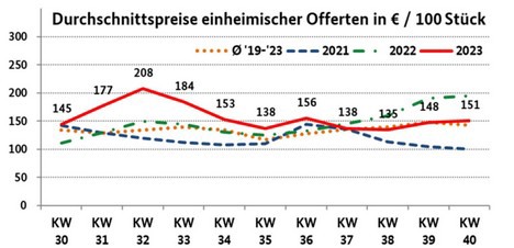 La coliflor nacional predominó en la semana 40. La mayoría se vendían en paquetes de 6 unidades; solo en Hamburgo se podían adquirir también en surtidos de 8. En la ciudad hanseática, las ofertas nacionales estaban flanqueadas por algunas polacas, mientras que en Múnich no tenían rival. En Fráncfort y Colonia aparecieron lotes belgas y holandeses. En Berlín, unas pocas importaciones holandesas se unieron a las alemanas. La disponibilidad fue suficiente para satisfacer la demanda.