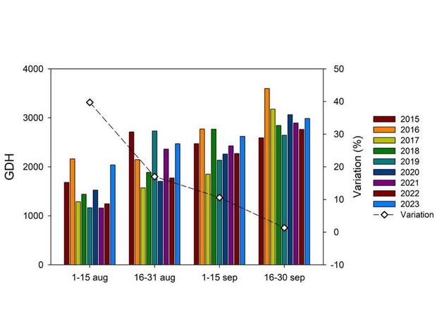 La gráfica muestra la acumulación de GDH (horas grado día) por periodo en Sagrada Familia y e porcentaje de variación de 2023 con respecto a la media de cada periodo de las últimas temporadas.