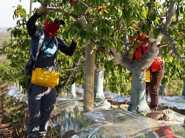 Empleados de Garces Fruit recolectando las primeras cerezas de la temporada 2023/24.