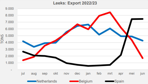 Las temporadas de exportación holandesa y belga son bastante similares. Para ambas, el punto álgido es el invierno, de diciembre a marzo. Los puerros españoles se comercializan principalmente en mayo y junio. En la campaña 2022/23, las exportaciones belgas cayeron bruscamente en junio, algo menos que las holandesas. Antes, Bélgica era siempre el proveedor más importante.