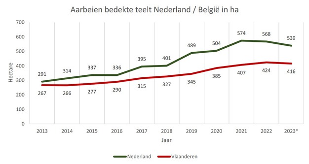 En los Países Bajos, la superficie de fresa bajo invernaderos y túneles casi se ha duplicado en una década. También Flandes registra un aumento constante de la superficie. En los últimos años, los estadísticos flamencos señalan un cambio del cultivo al aire libre al cultivo cubierto. El cultivo al aire libre ha aumentado un 10,2% en 2023, mientras que el cultivo en invernadero ha crecido un 9,5%. En 2022, el cultivo al aire libre holandés contaba con 839 hectáreas de producción. De las 1.040 hectáreas de Flandes en 2023, 416 estaban permanentemente cubiertas.