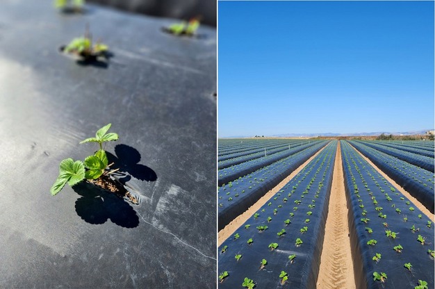 Campo de fresas recién plantado en Santa María para la campaña de primavera/verano de 2024.