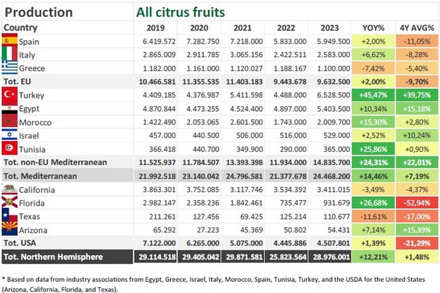 La Organización Mundial de Cítricos (WCO) ha publicado su previsión anual del hemisferio norte para la temporada 2023-24. Se publicó tras la feria Global Citrus Outlook organizada el 15 de noviembre por la WCO. La previsión se basa en datos de Egipto, Grecia, Israel, Italia, Marruecos, España, Túnez, Turquía y Estados Unidos. Se prevé que la producción de cítricos alcance las 28.976.001 toneladas, lo que representa un aumento del 12,2% en comparación con la anterior temporada alta. La previsión 2023/2024 es un 1,48% superior a la media de las cuatro últimas temporadas.