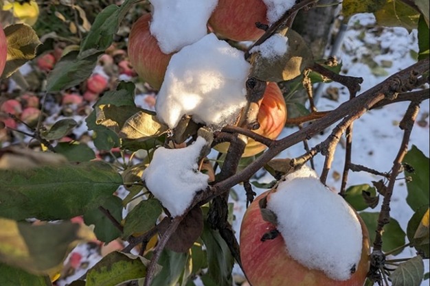Luego, en la última semana de octubre y en noviembre, llegó la primera helada, aunque más tarde de lo habitual. "No fue un gran problema en otoño. La mayor parte de la fruta ya había caído, y lo que había en ese momento no merecía la pena cosecharlo, como las Honeycrisp partidas", dice, y apunta que al final de la temporada también cayó algo de granizo.