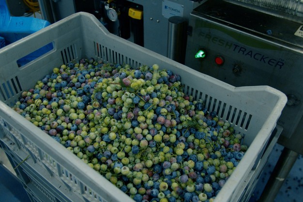 Otra buena razón para la cosecha mecánica es la necesidad de velocidad. Las máquinas trabajan mucho más rápido que las personas. Pero las máquinas no pueden ver ni juzgar los arándanos en los arbustos de la misma manera que lo hacen las personas. Además de cosechar buena fruta, las máquinas también recolectan frutas que están verdes o agrupadas en racimos. Al trabajar estrechamente con los productores y empresas envasadoras de arándanos, TOMRA Food reconoció la necesidad de agregar valor a la cadena de suministro, reduciendo los requisitos de mano de obra y al mismo tiempo garantizando un producto de la más alta calidad.